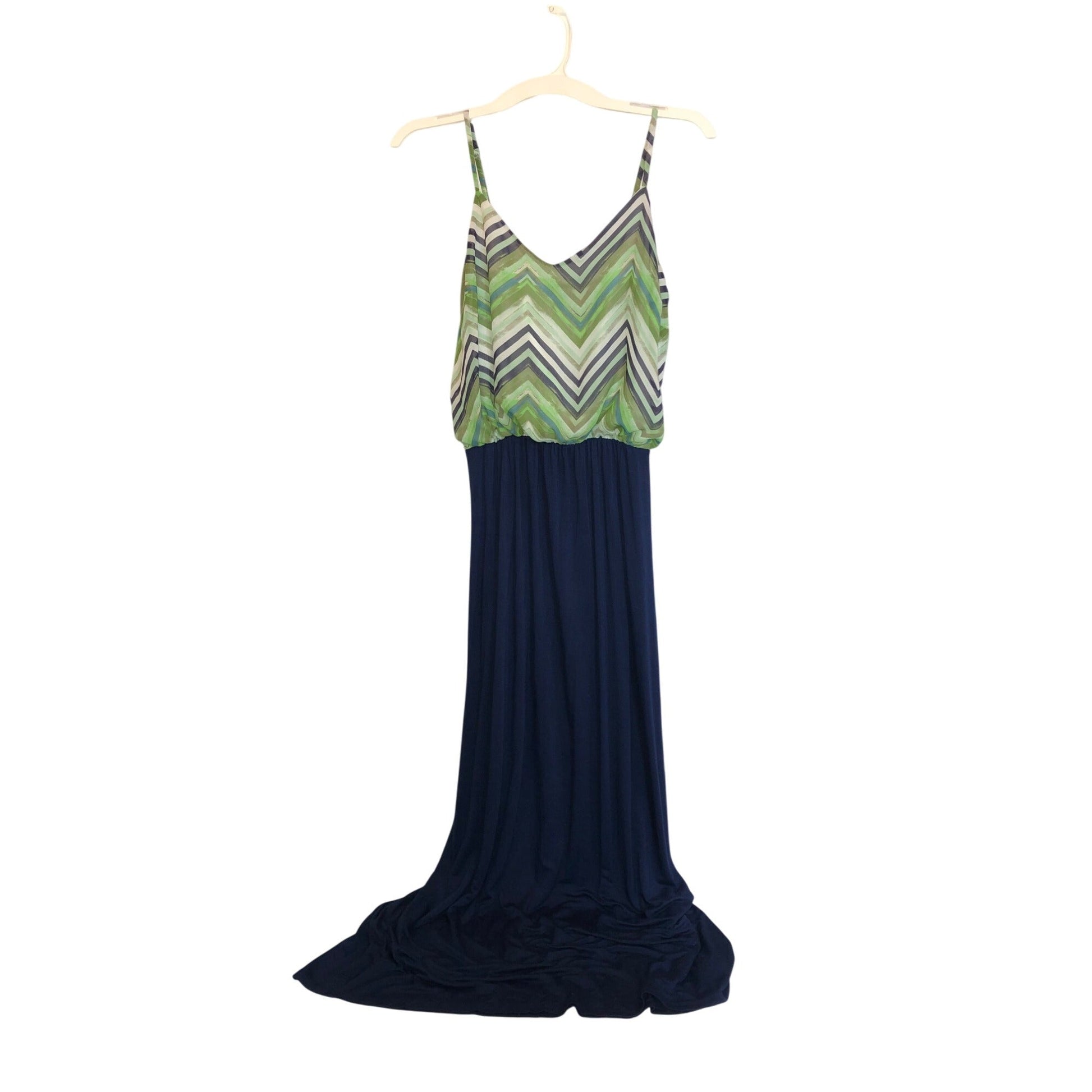 This elegant maxi dress features a chevron print top in blue, green, and white hues, perfect for any occasion. Its flowy design and vibrant colors make it a stylish choice for summer outings or beach vacations.