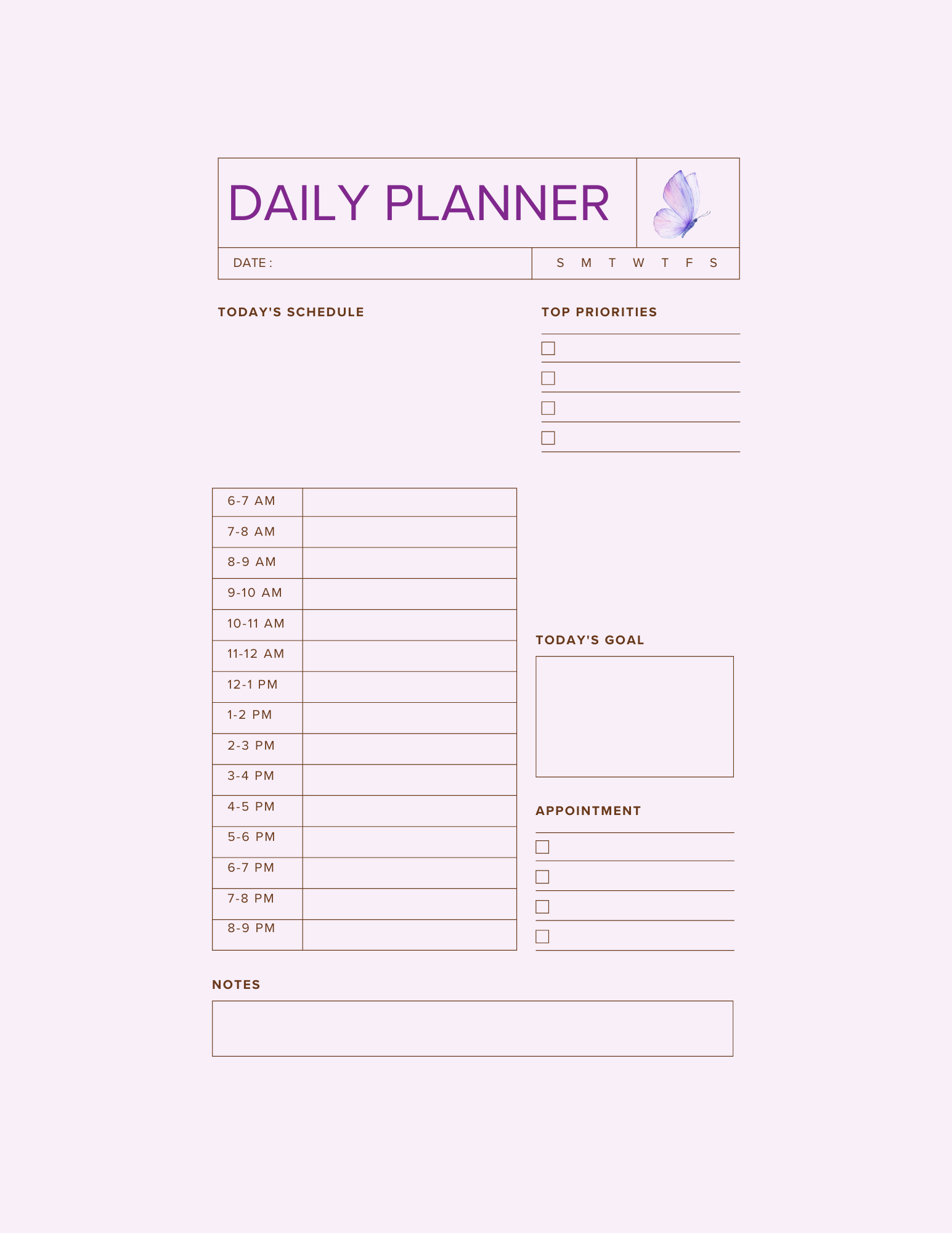 Stay organized with this beautifully designed daily planner page featuring an elegant butterfly motif. Download and print it instantly to add a touch of charm to your daily planning routine. Perfect for keeping track of your tasks while enjoying a visually pleasing layout.