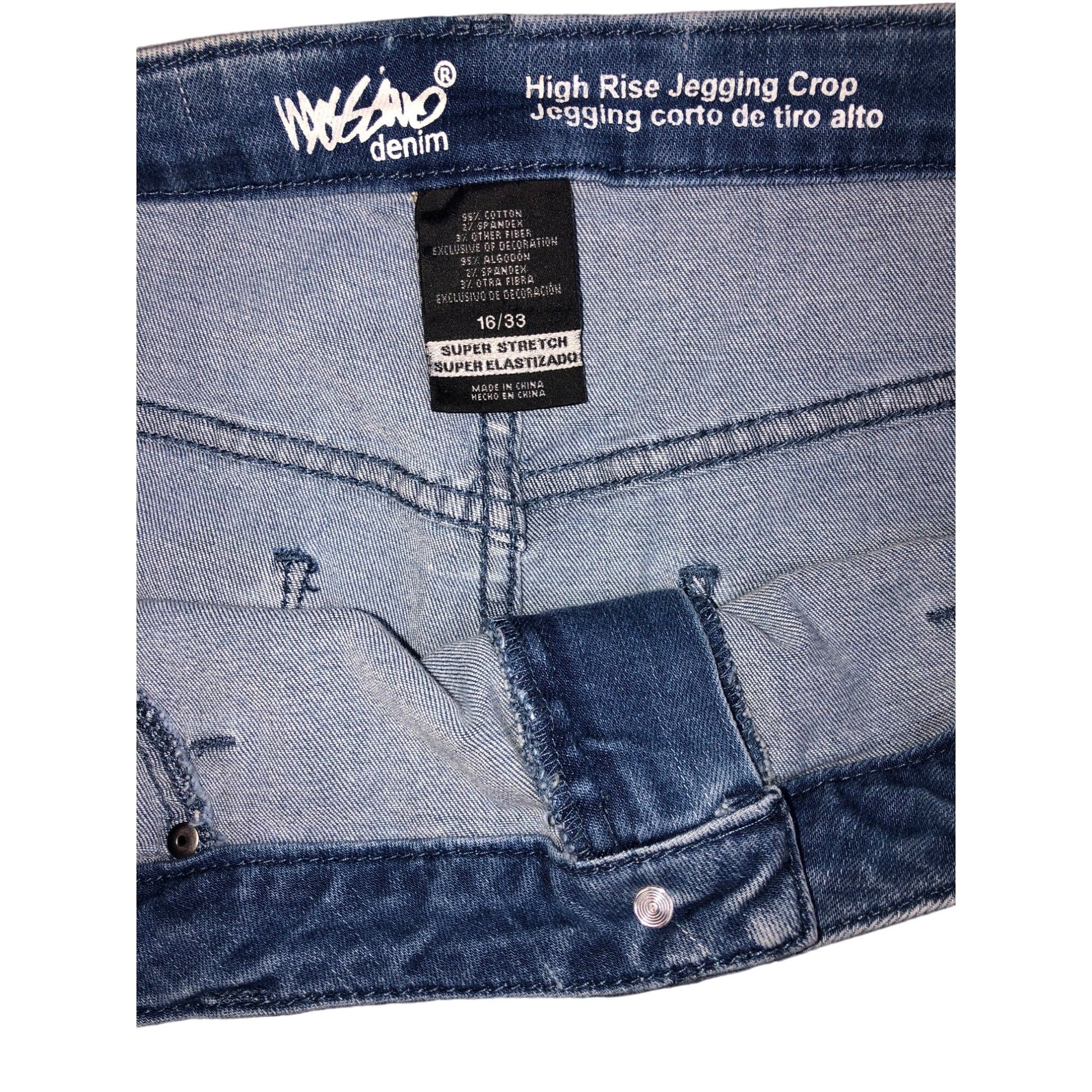 Mossimo Women's High Rise Jeans are pre-owned, size 16/33 jeggings. These cropped girlfriend jeans feature striking floral embroidery and are made from super stretchy, 95% cotton, 2% spandex, and 3% other fiber.