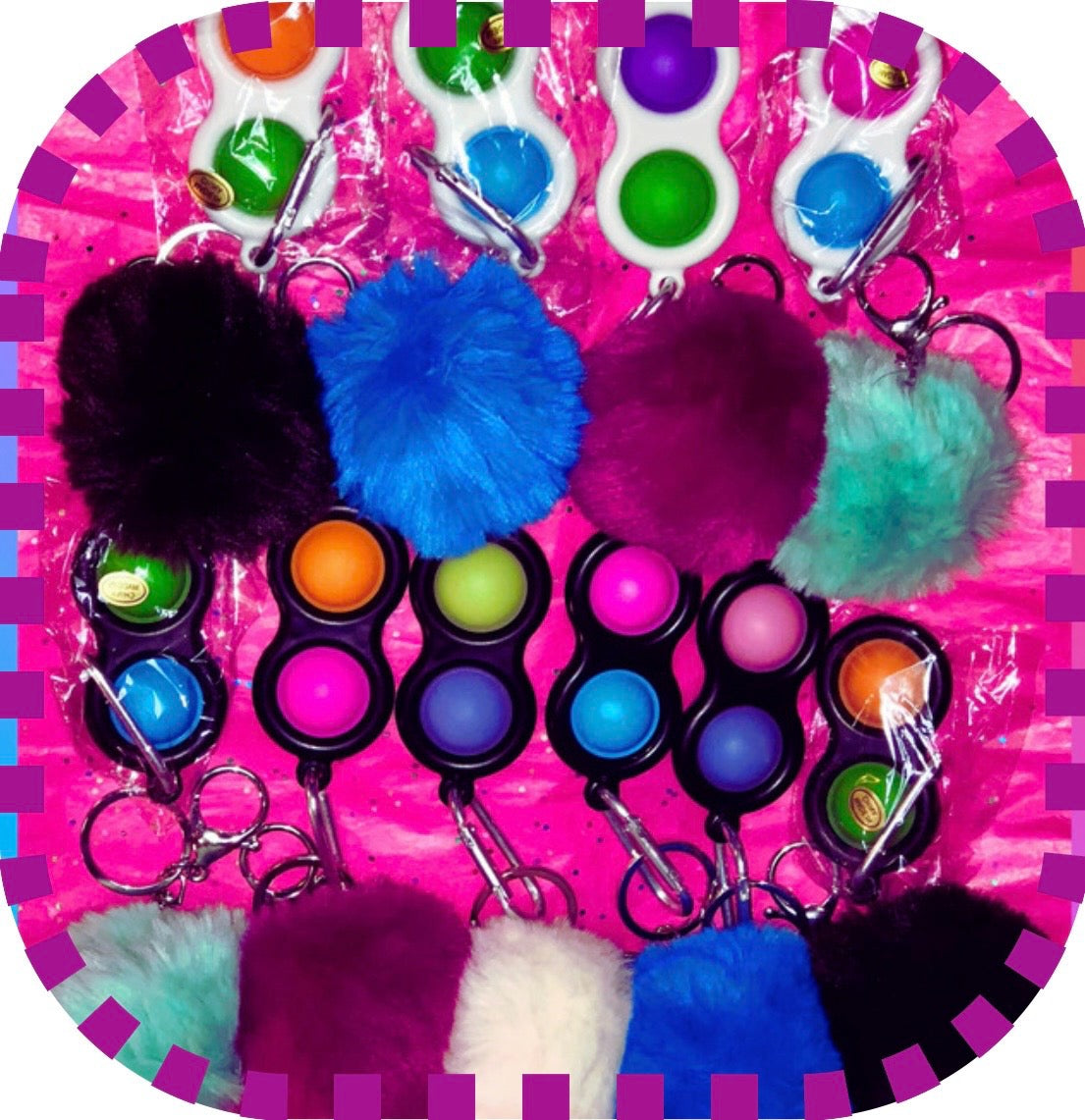Beautiful Bright Colorful (1)Fur Puff Ball Keychain + (1)W/ Pop It Keychain