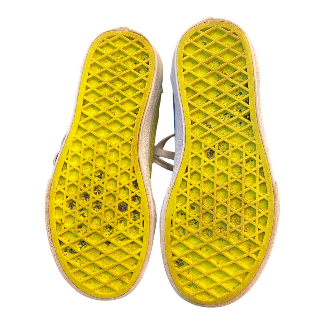 - Brighten up any ensemble with the Vans Old Skool Neon Color-Block Skate Shoe. This pre-loved youth size 12.5 classic sneaker boasts a colorful canvas upper with iconic side stripes for a stand-out look. Comfort and security come easy with its cushioned footbed, padded collar, and lace closure. Take command of the streets in style and confidence with its signature grippy rubber outsole and waffle tread for superior durability and traction. Get ready to make a statement!